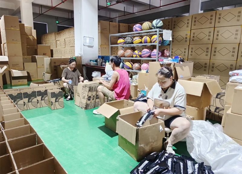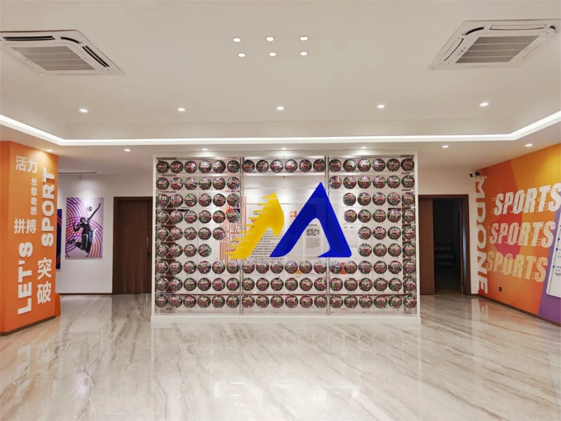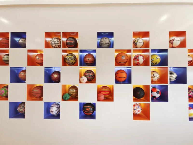 W showroomie produktu Meidong Sports znajdują się dziesiątki produktów do koszykówki, piłki nożnej i siatkówki o różnych stylach i jasnych kolorach.